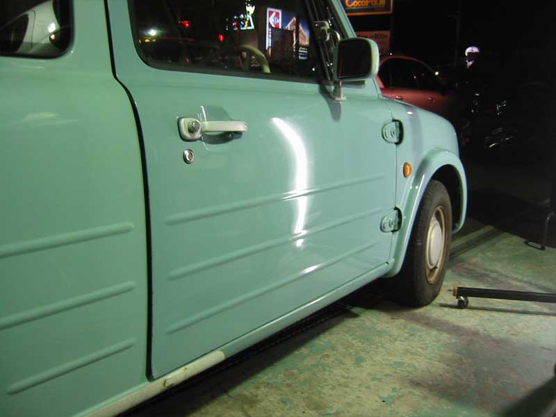 どう考えても鈑金!もしくはドア交換?と思える様なヘコミですが、社長に乗せられてついつい。